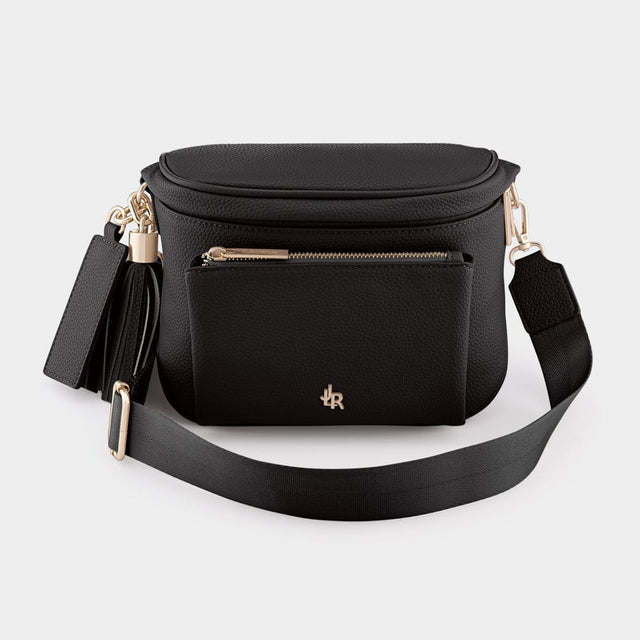Johnny Loves Rosie’s Black Rumer Sling Bag' is so versatile - you can sling it across your body, over one shoulder or around your waist. This must-have bag is made from award-winning vegan leather and embossed with the brand's signature gold-plated hardware. It's compact but has enough space inside for the essentials such as your cardholder, phone, earphones and a small water bottle. The Rumer features a signature tassel keyring and complimentary dust bag and has the ability to be personalised for free, to suit your personal style.