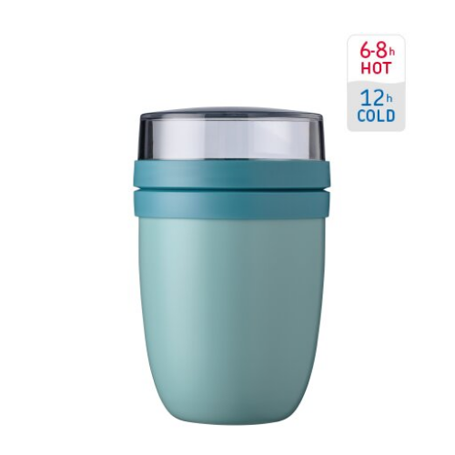 Always short of time in the mornings? Sounds familiar. Take with you the insulated lunch pot Ellipse in Nordic green with fresh yoghurt and granola (handy, because it will stay crunchy in the lid!). Your yoghurt will stay lovely and cool... right up until lunch time in this double walled stainless steel pot! In the train or at work just mix it together and... ready. On an evening shift, at school or at the gym without a microwave close by? No problem: just heat up some soup at home, pour it in the lunch pot, croutons in the lid... et voilá, even after a couple of hours you will have a tasty hot meal! This yoghurt mug keeps your food hot up until 6-8 hours* and cold up to 12. Naturally the insulated pot is 100% leak proof and will stay cool and dry on the outside, regardless the temperature of its contents. Both compartments have their own lid, which can be separated and attached together with a simple twist. The lid of the insulated lunch pot also has insulating qualities, which is why the lid of the regular yoghurt mug can't be used for it. In order for you to enjoy using your coloured thermo lunch pot for as long as possible we advise you to hand wash it. However, the plastic parts of the cap can be cleaned in the dishwasher.