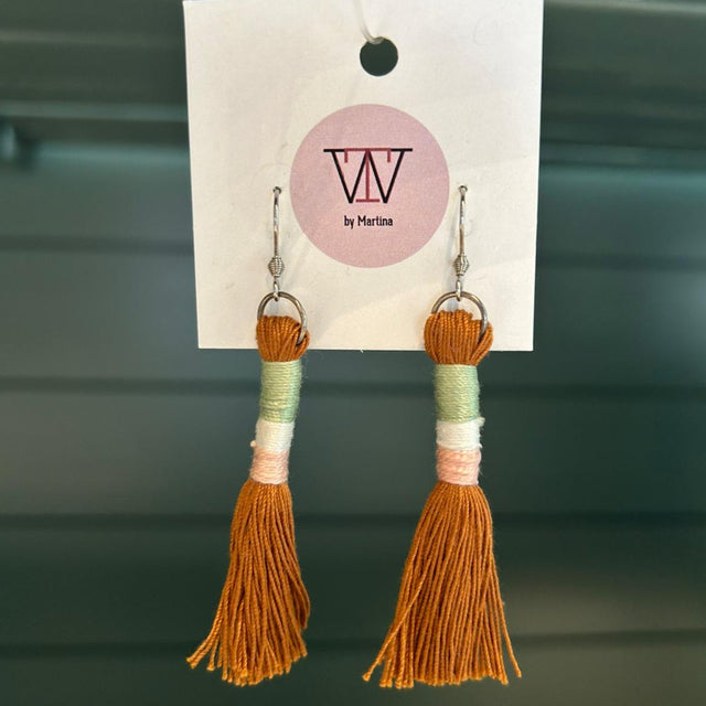Simple dainty short brown cotton earrings with green, white & pink detailing.