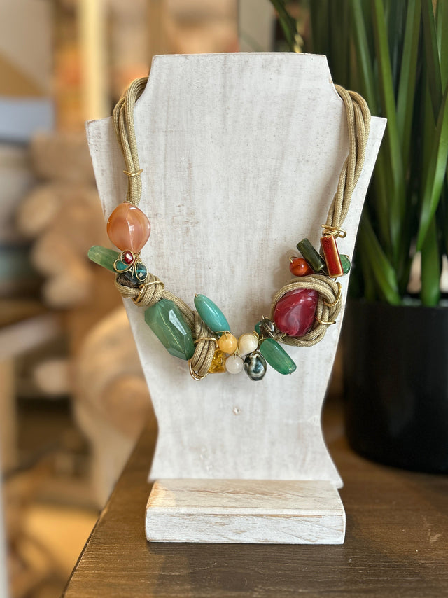 This is a stunning necklace with a unique light mustard cord statement that is combined with tones of green, turquoise, red, and creams. This statement piece will sit elegantly on your collar bone, with a 17cm strap on each side. Elevate any outfit with this colourful and versatile accessory.